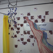 Shower curtains part to distance two flying figures. Behind are hands clinging onto the towel rail, fingers twisted around string on the tiles and blue drops of tears falling from the ceiling.